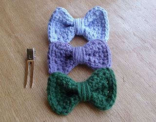 And these are my first batch of crochet bow hair clips! Which were included in my shop update! These are kind of an experiment. Basically each little set comes with one clip, and then three bows. The idea is that the bows are interchangeable. You just slip the clip in the back of the bows.